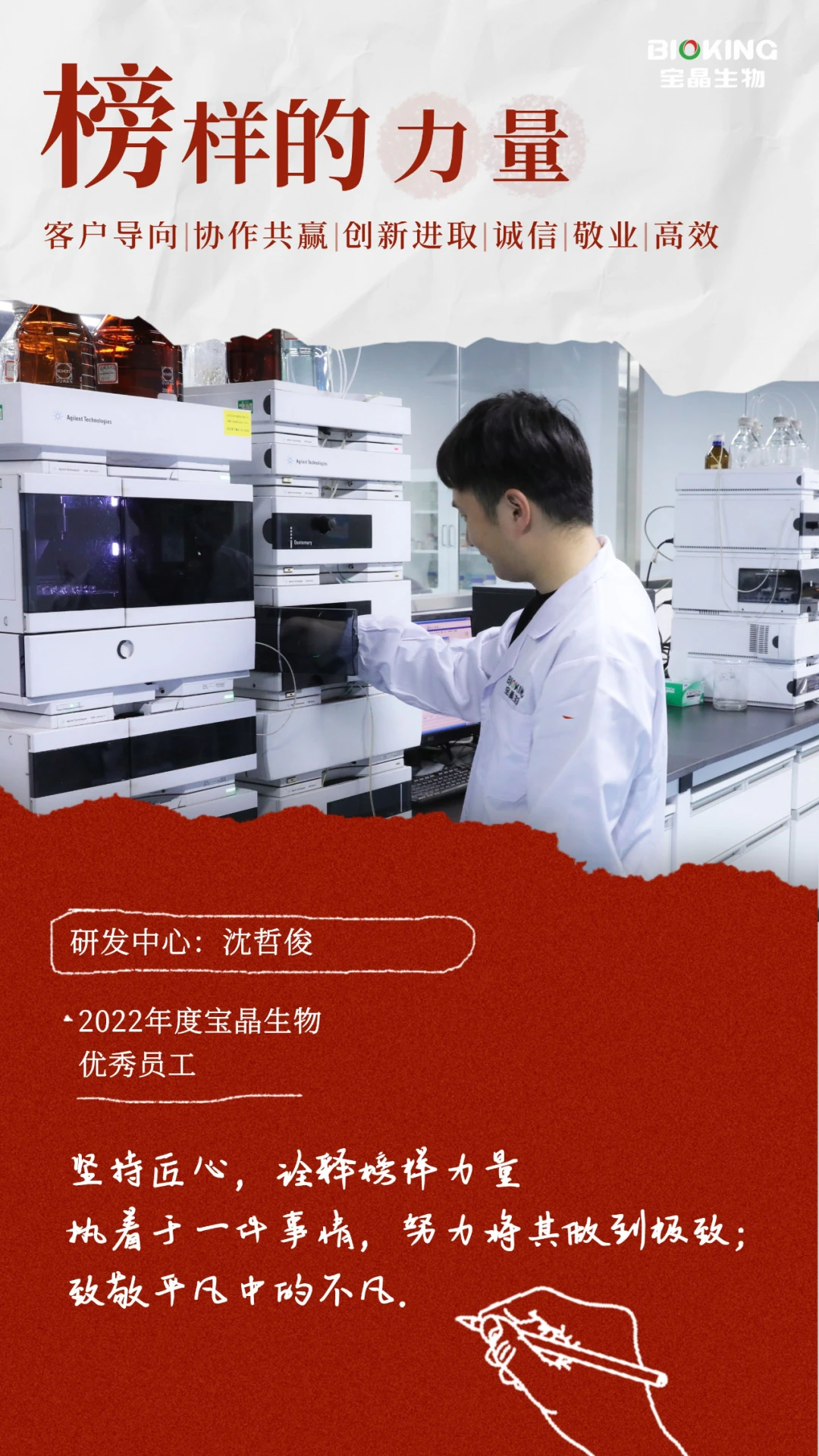“兢兢业业,亦庄亦谐” 2021年2月,略显青涩的他以一名研发质检员入职6686体育官网,这份工作一做就是两年,这两年里他几乎没有出过差错。研发组长王静然说:“以前在学校时我也做过液相检测,我知道样品稀释的精准度对检测数据有很大的影响,需要检测者细致入微,也十分考验检测者的耐心,看似简单的工作,要做的好不出问题真的很难。”沈哲俊的工作是每天负责研发部门的样品以及生产过程中样品的检验工作。就是这样一件重复的事情,让沈哲俊找到了自己的价值。他说:“做一件事不难,但坚持做同一件事不简单,质检也不是简单的检测,它是产品品质的保障,是研发必不可少的流程。每次看到研发的需求被解决那一刻,就觉得自己所做的一切都非常有意义。”简单的事情重复做,重复的事情坚持做。平时,他也会主动向部门同事学习一些分子生物实验的知识,在观摩过程中遇到不懂的也会及时向同事请教或者在网上搜索相关文献。正是因为这份坚持和努力,沈哲俊于2022年被评为“优秀员工”。 有一次他摔伤了腿,但是当时部门检测工作很紧张,沈哲俊为了不耽误大家的工作,毅然坚持上班。他看起来永远那么积极、阳光,总能让身边的人感觉到快乐与希望。他以一己之力带动了整个实验室的氛围,让大家在工作中变得不再枯燥。王静然回忆道,在她刚刚入职时,因为环境比较陌生,感觉很拘谨,当时是沈哲俊主动和她说话,能够这么快的融入环境,他有很大的功劳。上班时间,他在做好自己检测工作之余还主动帮部门同事分担一些实验中的力气活,他也毫无怨言。同事们总是开玩笑似的问他:“你不愁吃穿,生活无忧,为什么这么拼?” 而他总是谦虚地说:“既然选择了,就要坚持,我之所以这么努力,是为了让自己的生活丰富一点,人活一世希望有所作为。”也就是因为他这颗好学进取的心,他被提升为研发助理。王静然说:“沈哲俊对自己要求很严格,作为我的助理,把任务交给他,我是最放心的!” 这样一个对工作认真负责的人,在生活中又有着另一面。每逢周末只要自己有时间,都会去踢球,平时也会运动锻炼身体,对生活充满了热情。 “让梦想扎根6686体育官网”,正因为有如沈哲俊这样一批又一批优秀的员工在岗位上努力工作,6686体育官网才能走的更远。学习身边的榜样,以榜样激励自我,共同成就梦想。